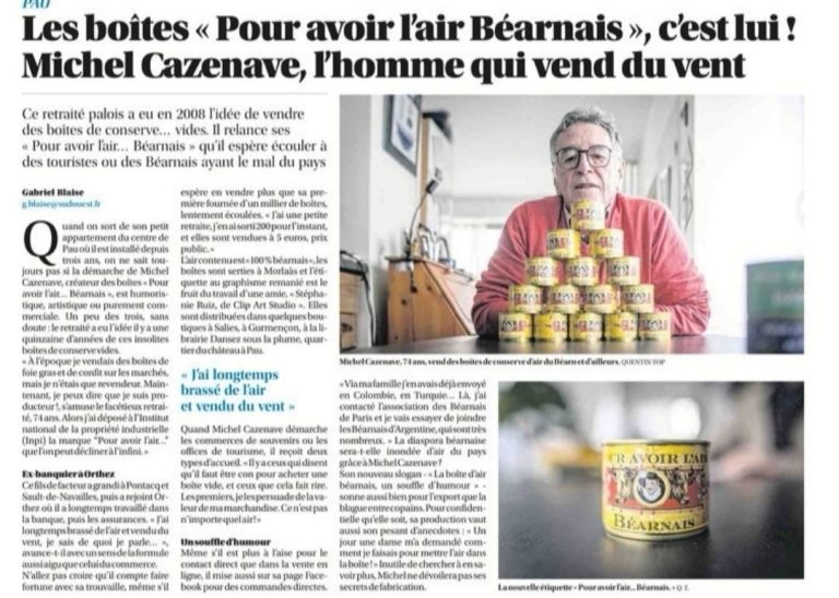 Au début des années 2000 je commercialisais des produits régionaux en conserve sur les foires et marchés locaux en compagnie d'autres participants qui eux étaient producteurs et me reprochaient d'etre un revendeur...ce qui était vrai !Je revendais sous l'appellation LES PLAISIRS D'HENRI (je vous expliquerai pourquoi une autre fois )des conserves achetées à une conserverie béarnaise. Ayant toujours eu beaucoup d'humour je cherchais une idée originale pour devenir producteur et après quelques nuits de réflexion une inspiration légère comme le vent vint me chatouiller l'esprit ... J'avais travaillé 30 ans dans la Banque et les Assurances...30 ans à vendre du vent et à brasser de l'air: et si je mettais l'air du Béarn en boite ?? Nul besoin de cuisson, c'est bio et léger et surtout 100% béarnais ! Et ainsi j'obtiens humoristiquement le statut de producteur !!!